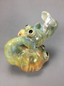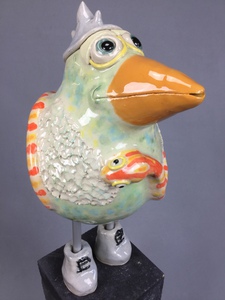 2020Deze vogel komt net uit de vijver. Hij heeft een kikker op zijn borst en een waterlelie aan zijn nek. De hierbij opgegeven maten zijn inclusief aluminium benen/poten, voeten van keramiek en sokkel van beton (15x15x30 cm).