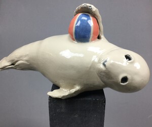 2018Een handgevormde zeehond met kleurrijke strandbal die hij op het strand gevonden heeft Hij is gefotografeerd op een betonnen sokkel, deze wordt niet meegeleverd.