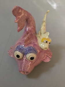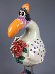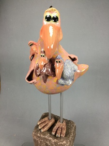 2019De grappige vogel heeft een bal en een vis onder zijn vleugels en is ca. 25 cm hoog. De hierbij opgegeven maten zijn inclusief aluminium benen, poten van keramiek en sokkel van graniet (ook te leveren met betonnen sokkel (15x15x30 cm) dan is de totale hoogte zo'n 70 cm). Een zeester kroont zijn hoofd. Dit jonge vogeltje heeft een sos-ketting, zodat zijn ouders zijn op te sporen als hij ze kwijt geraakt is.