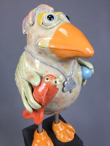 2020De vogelouder is op een zonnige dag met zijn kuiken een dagje naar de kinderboerderij. Zijn lichaam is met diverse boerderijdieren van kleurrijk keramiek 'beplakt'. De hierbij opgegeven maten zijn inclusief aluminium benen/poten, schoenen van keramiek en sokkel van beton (15x15x30 cm)